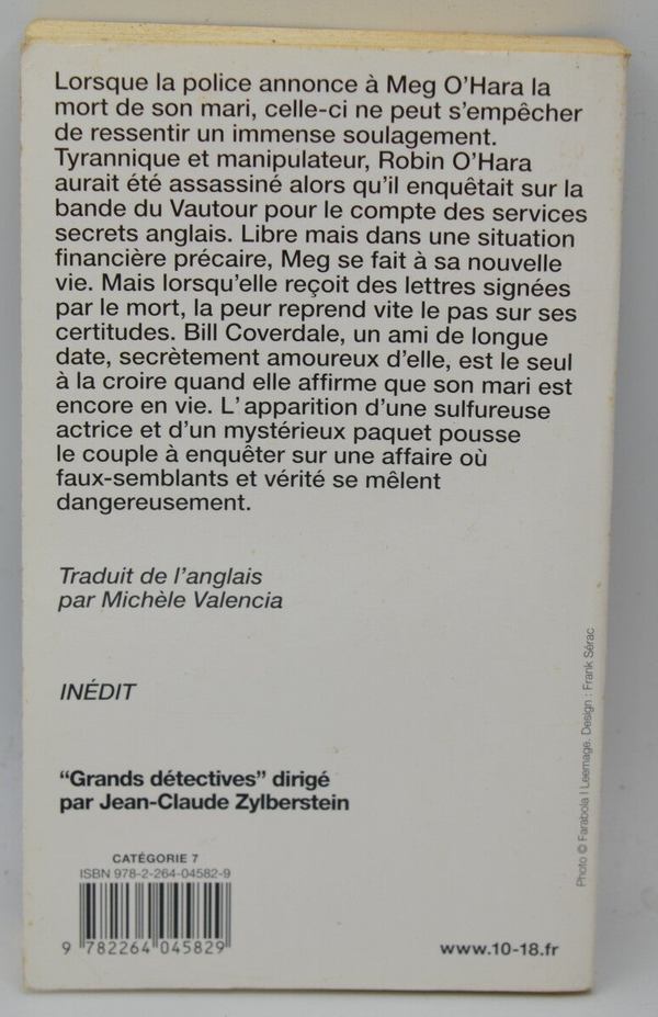Lorsque la police annonce à Meg O'Hara la mort de son mari, celle-ci ne peut s'empêcher de ressentir un immense soulagement. Tyrannique et manipulateur, Robin O'Hara aurait été assassiné alors qu'il enquêtait sur la bande du Vautour pour le compte des services secrets anglais. Libre mais dans une situation financière précaire, Meg se fait à sa nouvelle vie. Mais lorsqu'elle reçoit des lettres signées par le mort, la peur reprend vite le pas sur ses certitudes. Bill Coverdale, un ami de longue date, secrètement amoureux d'elle, est le seul à la croire quand elle affirme que son mari est encore en vie. L'apparition d'une sulfureuse actrice et d'un mystérieux paquet pousse le couple à enquêter sur une affaire où faux-semblants et vérité se mêlent dangereusement.