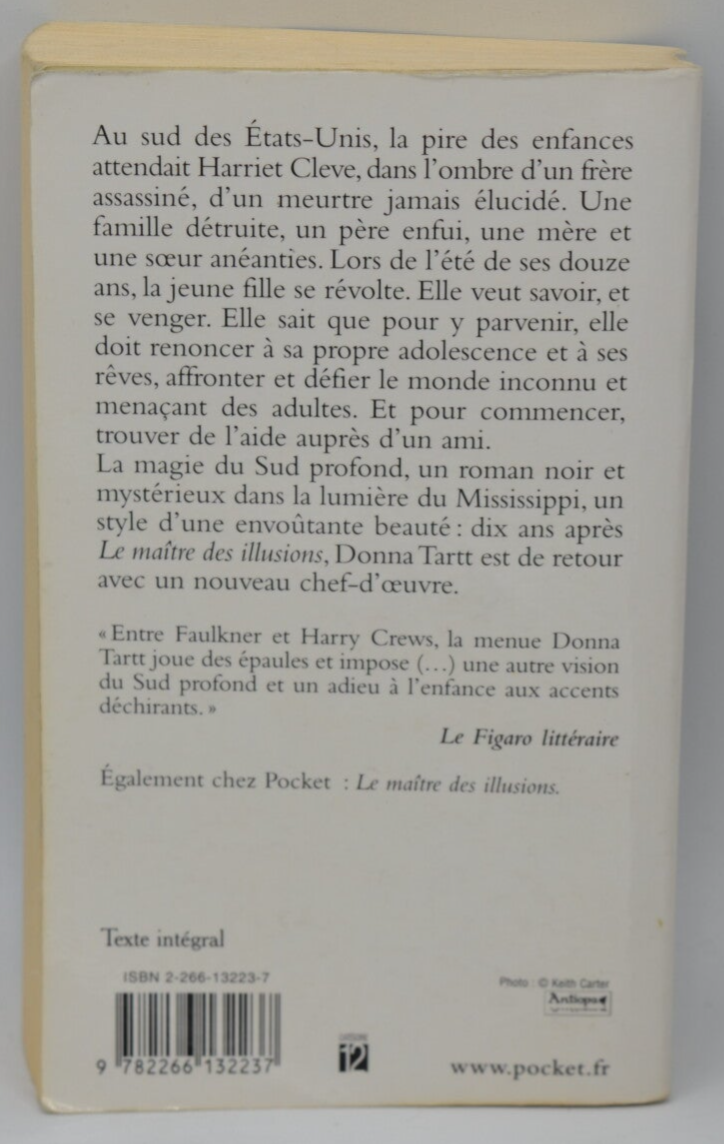 Au sud des États-Unis, la pire des enfances attendait Harriet Cleve, dans l'ombre d'un frère assassiné, d'un meurtre jamais élucidé. Une famille détruite, un père enfui, une mère et une sueur anéanties. Lors de l'été de ses douze ans, la jeune fille se révolte. Elle veut savoir, et se venger. Elle sait que pour y parvenir, elle doit renoncer à sa propre adolescence et à ses rêves, affronter et défier le monde inconnu et menaçant des adultes. Et pour commencer, trouver de l'aide auprès d'un ami. La magie du Sud profond, un roman noir et mystérieux dans la lumière du Mississippi, un style d'une envoûtante beauté : dix ans après Le maître des illusions, Donna Tartt est de retour avec un nouveau chefs-d'œuvre. " Entre Faulkner et Harry Crews, la menue Donna Tartt joue des épaules et impose [...] une autre vision du Sud profond et un adieu à l'enfance aux accents déchirants. " Le Figaro littéraire.