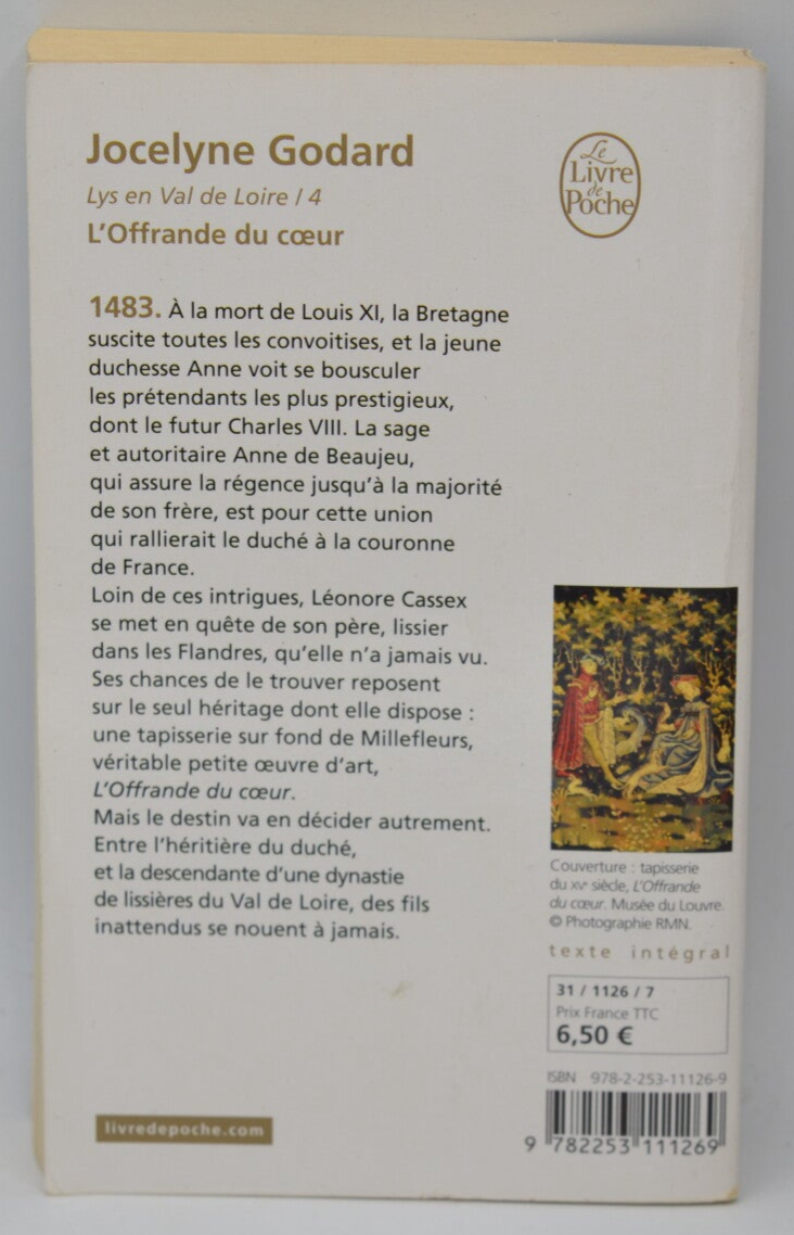 ses chances de le trouver reposent sur le seul héritage dont elle dispose : une tapisserie sur fond de millefleurs, véritable petite oeuvre d'art, l'offrande du coeur. mais le destin va en décider autrement. entre l'héritière du duché, et la descendante d'une dynastie de lissières du val de loire, des fils inattendus se nouent à jamais.