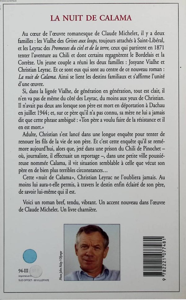 Au coeur de l'oeuvre romanesque de Claude Michelet, il y a deux familles : les Vialhe des Grives aux loups, toujours attachés à Saint-Libéral, et les Leyrac des Promesses du ciel et de la terre, ceux qui partirent en 1871 tenter l'aventure au Chili et dont certains regagnèrent le Bordelais et la Corrèze. Un jeune couple a réuni les deux familles : Josyane Vialhe et Christian Leyrac. Et ce sont eux qui sont au centre de ce nouveau roman : La nuit de Calama. Ainsi se lient les destins familiaux et s'affirme l'unité d'une oeuvre.