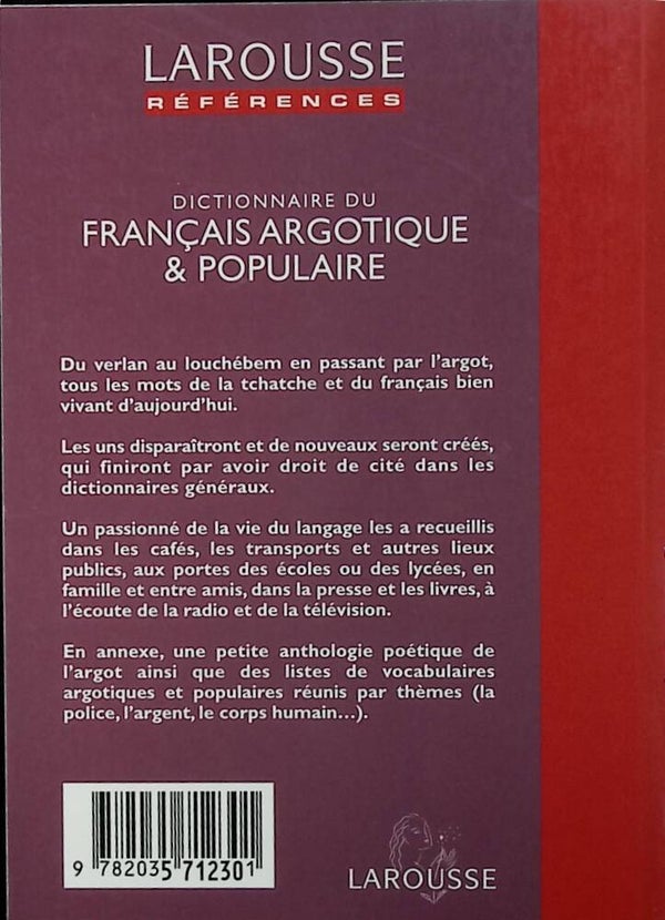Du verlan au louchébem en passant par l'argot, tous les mots de la tchatche et du français bien vivant d'aujourd'hui. Les uns disparaîtront et de nouveaux seront créés, qui finiront par avoir droit de cité dans les dictionnaires généraux. Un passionné de la vie du langage les a recueillis dans les cafés, les transports et autres lieux publics, aux portes des écoles ou des lycées, en famille et entre amis, dans la presse et les livres, à l'écoute de la radio et de la télévision. En annexe, une petite anthologie poétique de l'argot ainsi que des listes de vocabulaires argotiques et populaires réunis par thèmes (la police, l'argent, le corps humain...).
