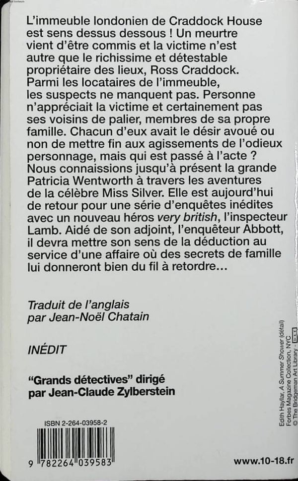 L'immeuble londonien de Craddock House est sens dessus dessous ! Un meurtre vient d'être commis et la victime n'est autre que le richissime et détestable propriétaire des lieux, Ross Craddock. Parmi les locataires de l'immeuble, les suspects ne manquent pas. Personne n'appréciait la victime et certainement pas ses voisins de palier, membres de sa propre famille. Chacun d'eux avait le désir avoué ou non de mettre fin aux agissements de l'odieux personnage, mais qui est passé à l'acte ? Nous connaissions jusqu'à présent la grande Patricia Wentworth à travers les aventures de la célèbre Miss Silver. Elle est aujourd'hui de retour pour une série d'enquêtes inédites avec un nouveau héros very british, l'inspecteur Lamb. Aidé de son adjoint, l'enquêteur Abbott, il devra mettre son sens de la déduction au service d'une affaire où des secrets de famille lui donneront bien du fil à retordre...