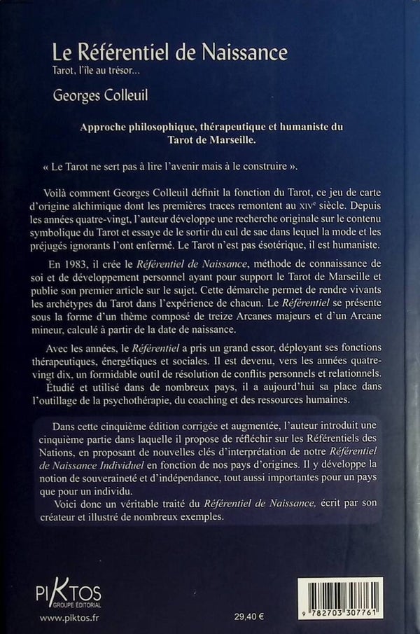 « Le Tarot ne sert pas à lire l’avenir mais à le construire ». Voilà comment Georges Colleuil définit la fonction du Tarot, ce jeu de carte d’origine alchimique dont les premières traces remontent au XIVe siècle. Depuis les années quatre-vingt, l’auteur développe une recherche originale sur le contenu symbolique du Tarot et essaye de le sortir du cul de sac dans lequel la mode et les préjugés ignorants l’ont enfermé. Le Tarot n’est pas ésotérique, il est humaniste. En 1983, il crée le Référentiel de Naissance, méthode de connaissance de soi et de développement personnel ayant pour support le Tarot de Marseille et publie son premier article sur le sujet. Cette démarche permet de rendre vivants les archétypes du Tarot dans l’expérience de chacun. Le Référentiel se présente sous la forme d’un thème composé de treize Arcanes majeurs et d’un Arcane mineur, calculé à partir de la date de naissance. Avec les années, le Référentiel a pris un grand essor, déployant ses fonctions thérapeutiques, énergétiques et sociales. Il est devenu, vers les années quatre-vingt dix, un formidable outil de résolution de conflits personnels et relationnels. Étudié et utilisé dans de nombreux pays, il a aujourd’hui sa place dans l’outillage de la psychothérapie, du coaching et des ressources humaines. Dans cette sixième édition corrigée et augmentée, l’auteur développe et approfondit les brisures simples et les brisures inversées. Il apporte également des précisions sur les éclipses, les Étoiles en maison 2 dans les Référentiels de couple, les dates de naissances incertaines et les dialectiques spéciales. Il introduit aussi un index qui n’existait pas dans les éditions précédentes, améliorant ainsi le travail des chercheurs. Voici donc un véritable traité du Référentiel de Naissance, écrit par son créateur et illustré de nombreux exemples.