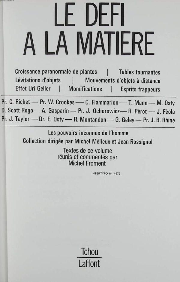 Titre : Le Défi à la matière - Croissance paranormale de plantes, tables tournantes, lévitations d'objets, mouvements d'objets à distance, effet Uri Geller, momifications, esprits frappeurs - Michel Froment - 1978 - livre