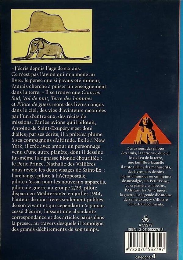 "J'écris depuis l'âge de six ans. Ce n'est pas l'avion qui m'a mené au livre. Je pense que si j'avais été mineur, j'aurais cherché à puiser un enseignement dans la terre." Il se trouve que Courrier Sud, Vol de nuit, Terre des hommes et Pilote de guerre sont des livres conçus dans le ciel, des vies d'aviateurs racontées par l'un d'entre eux, des récits de missions. Par les avions qu'il pilotait, Antoine de Saint-Exupéry s'est doté d'ailes; par ses écrits, il a prêté sa plume à ses compagnons d'altitude. Exilé à New York, il crée avec amour un personnage venu d'une autre planète, dont il dessine lui-même la tignasse blonde ébouriffée : le Petit Prince. Nathalie des Vallières nous révèle les deux visages de Saint-Ex : l'archange, pilote à l'Aéropostale, pilote d'essai pour les nouveaux appareils, pilote de guerre au groupe 2/33, pilote disparu en Méditerranée en juillet 1944; l'auteur de cinq livres seulement publiés de son vivant et qui cependant n'a jamais cessé d'écrire, laissant une abondante correspondance et des articles parus dans la presse, au travers desquels il témoigne des grands déchirements de son temps. Des avions, des pilotes, des amis; la terre vue du ciel, le ciel vu de la terre; une famille à laquelle il reste fidèle; des manuscrits, des livres, des dessins pleins d'humour ou empreints de nostalgie; un Petit Prince et sa planète en dessins; l'Afrique, les Amériques; la guerre. La légende d'Antoine de Saint-Exupéry s'illustre ici de 160 documents.