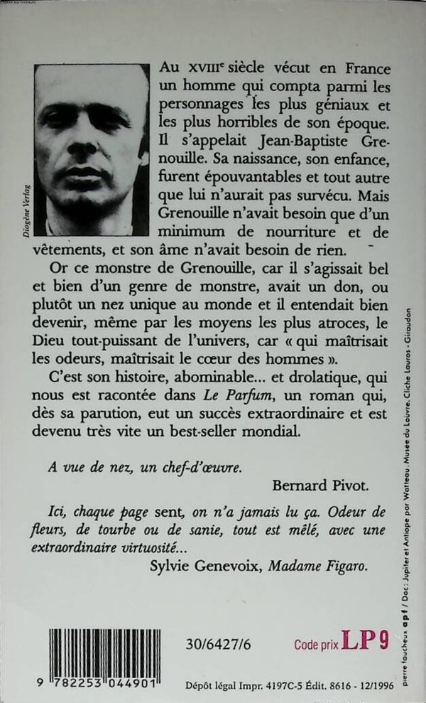 Au XVIIIe siècle vécut en France un homme qui compta parmi les personnages les plus géniaux et les plus horribles de son époque. Il s'appelait Jean-Baptiste Grenouille. Sa naissance, son enfance furent épouvantables et tout autre que lui n'aurait pas survécu. Mais Grenouille n'avait besoin que d'un minimum de nourriture et de vêtements, et son âme n'avait besoin de rien.