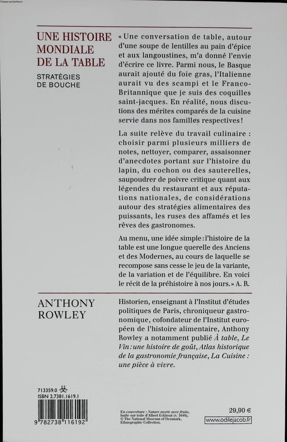 Une conversation de table, autour d'une soupe de lentilles au pain d'épice et aux langoustines, m'a donné l'envie d'écrire ce livre. Parmi nous, le Basque aurait ajouté du foie gras, l'Italienne aurait vu des scampi et le Franco-Britannique que je suis, des coquilles Saint-Jacques. En réalité, nous discutions des mérites comparés de la cuisine servie dans nos familles respectives ! La suite relève du travail culinaire : choisir parmi plusieurs milliers de notes, nettoyer, comparer, assaisonner d'anecdotes portant sur l'histoire du lapin, du cochon ou des sauterelles, saupoudrer de poivre critique quant aux légendes du restaurant et aux réputations nationales, de considérations autour des stratégies alimentaires des puissants, les ruses des affamés et les rêves des gastronomes. Au menu, une idée simple : l'histoire de la table est une longue querelle des Anciens et des Modernes, au cours de laquelle se recompose sans cesse le jeu de la variante, de la variation et de l'équilibre. En voici le récit, de la préhistoire à nos jours", A. R. Historien, enseignant à l'Institut d'études politiques de Paris, chroniqueur gastronomique, cofondateur de l'Institut européen de l'histoire alimentaire, Anthony Rowley a notamment publié À table, Le Vin : une histoire de goût, Atlas historique de la gastronomie française, La Cuisine : une pièce à vivre.