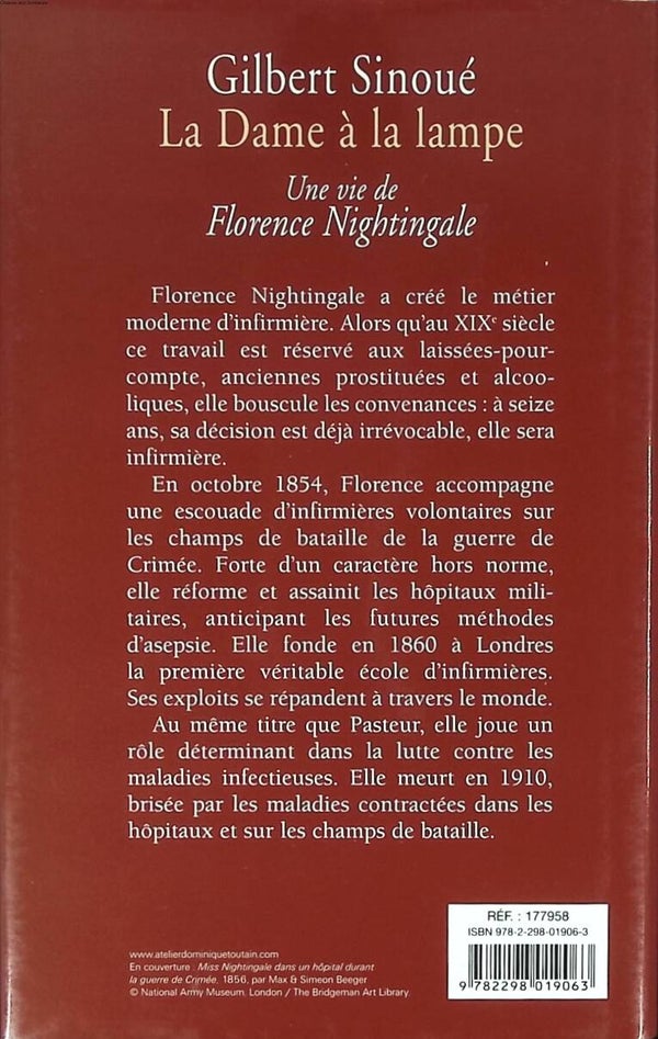 On appelait Florence Nightingale "la Dame à la lampe" parce qu'on la voyait parcourir la nuit les hôpitaux militaires, éclairée d'une lampe à pétrole. Elle a créé le métier moderne d'infirmière. Alors qu'au XIXᵉ siècle ce travail est réservé aux laissées-pour-compte, Miss Nightingale bouscule les convenances, au désespoir de sa famille. Elle réforme et assainit les hôpitaux militaires en pleine guerre de Crimée. Elle fonde en 1860 à Londres la première véritable école d'infirmières. Au même titre que Pasteur, elle joue un rôle déterminant dans la lutte contre les maladies infectieuses. Construisant cette biographie comme un roman policier, Gilbert Sinoué retrace le destin de Florence Nightingale, enquêtant sur les zones d'ombre et de lumière de cette femme d'exception..