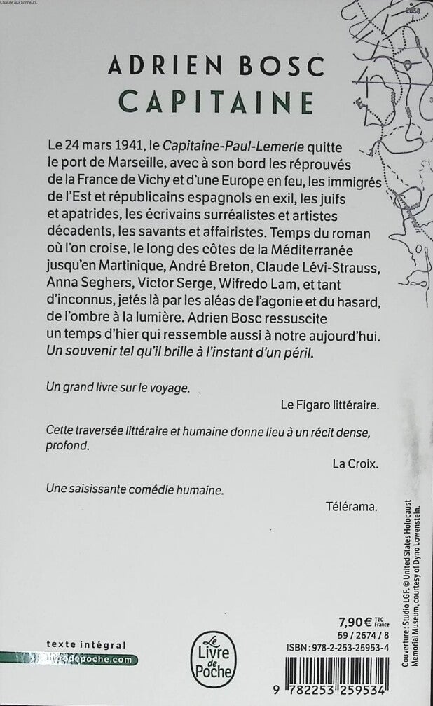 Le 24 mars 1941, le Capitaine-Paul-Lemerle quitte le port de Marseille, avec à son bord les réprouvés de la France de Vichy et d’une Europe en feu, les immigrés de l’Est et républicains espagnols en exil, les juifs et apatrides, les écrivains surréalistes et artistes décadents, les savants et affairistes. Temps du roman où l’on croise, le long des côtes de la Méditerranée jusqu’en Martinique, André Breton, Claude Lévi-Strauss, Anna Seghers, Victor Serge, Wifredo Lam, et tant d’inconnus, jetés là par les aléas de l’agonie et du hasard, de l’ombre à la lumière. Adrien Bosc ressuscite un temps d’hier qui ressemble aussi à notre aujourd’hui. Un souvenir tel qu’il brille à l’instant d’un péril.