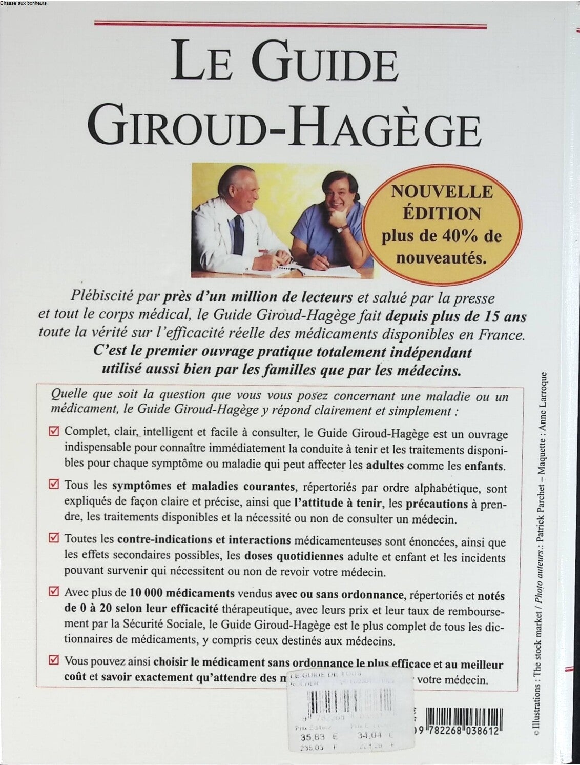 Plébiscité par près d'un million de lecteurs et salué par la presse et tout le corps médical, le Guide Giroud-Hagège fait depuis plus de 15 ans toute la vérité sur l'efficacité réelle des médicaments disponibles en France. C'est le premier ouvrage pratique totalement indépendant utilisé aussi bien par les familles que par les médecins. Quelle que soit la question que vous vous posez concernant une maladie ou un médicament, le Guide Giroud-Hagège y répond clairement et simplement : Complet, clair, intelligent et facile à consulter, le Guide Giroud-Hagège est un ouvrage indispensable pour connaître immédiatement la conduite à tenir et les traitements disponibles pour chaque symptôme ou maladie qui peut affecter les adultes comme les enfants. Tous les symptômes et maladies courantes, répertoriés par ordre alphabétique, sont expliqués de façon claire et précise, ainsi que l'attitude à tenir, les précautions à prendre, les traitements disponibles et la nécessité ou non de consulter un médecin. Toutes les contre-indications et interactions médicamenteuses sont énoncées, ainsi que les effets secondaires possibles, les doses quotidiennes adulte et enfant et les incidents pouvant survenir qui nécessitent ou non de revoir votre médecin. Avec plus de 10 000 médicaments vendus avec ou sans ordonnance, répertoriés et notés de 0 à 20 selon leur efficacité thérapeutique, avec leurs prix et leur taux de remboursement par la Sécurité Sociale, le Guide Giroud-Hagège est le plus complet de tous les dictionnaires de médicaments, y compris ceux destinés aux médecins. Vous pouvez ainsi choisir le médicament sans ordonnance le plus efficace et au meilleur coût et savoir exactement qu'attendre des médicaments prescrits par votre médecin.