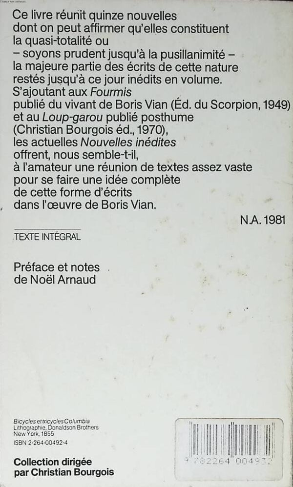 Ce livre réunit quinze nouvelles, écrites entre 1946 et 1950, par le merveilleux romancier de L’Ecume des jours. On y voit un Boris Vian tout jeune explorer les voies qui assureront sa célébrité : fantaisie, truculence, dérision et absurde, dans la tradition d’un Alphonse Allais. Quels sont les vrais mobiles du meurtre d’Abel par Caïn ? Pourquoi est-il indispensable d’emmener son fiancé (ou sa fiancée) à la piscine ? Comment séduire une jeune femme qui n’aime que les hommes impuissants ? A ces questions et à bien d’autres, on trouvera les réponses au fil de ces savoureux récits dont plusieurs prennent pour toile de fond un Saint-Germain-des-Prés plein de bonne humeur et d’échos de jazz.