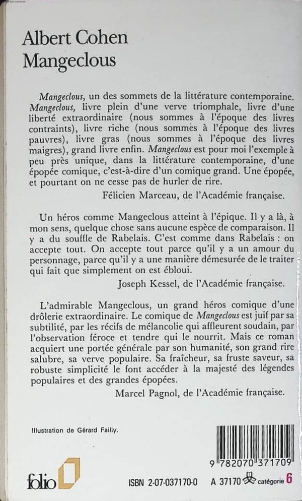 "Un héros comme Mangeclous atteint à l'épique. Il y a là, à mon sens, quelque chose sans aucune espèce de comparaison. Il y a du souffle de Rabelais. C'est comme dans Rabelais : on accepte tout. On accepte tout parce qu'il y a un amour du personnage, parce qu'il y a une manière démesurée de le traiter qui fait que simplement on est ébloui." Joseph Kessel. "L'admirable Mangecloux, un grand héros comique d'une drôlerie extraordinaire. Le comique de Mangeclous est juif par sa subtilité, par les récifs de mélancolie qui affleurent soudain, par l'observation féroce et tendre qui le nourrit. Mais ce roman acquiert une portée générale par son humanité, son grand rire salubre, sa verve populaire. Sa fraîcheur, sa fruste saveur, sa robuste simplicité le font accéder à la majesté des légendes populaires et des grandes épopées." Marcel Pagnol.