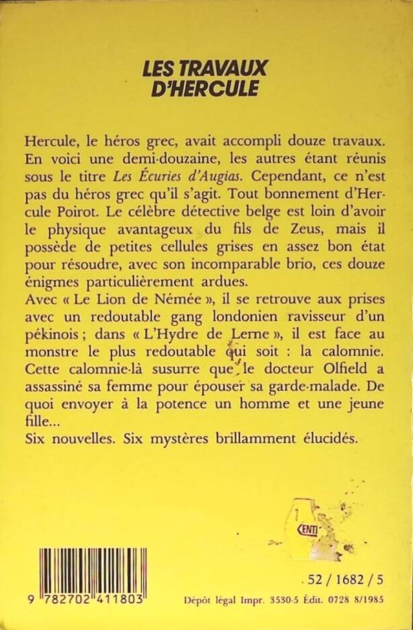 Hercule, le héros grec, avait accompli douze travaux. En voici une demi-douzaine, les autres étant réunis sous le titre LES ÉCURIES D'AUGIAS. Cependant, ce n'est pas du héros grec qu'il s'agit. Tout bonnement d'Hercule Poirot. Le célèbre détective belge est loin d'avoir le physique avantageux du fils de Zeus, mais il possède des petites cellules grises en assez bon état pour résoudre, avec son incomparable brio, ces douze énigmes particulièrement ardues.