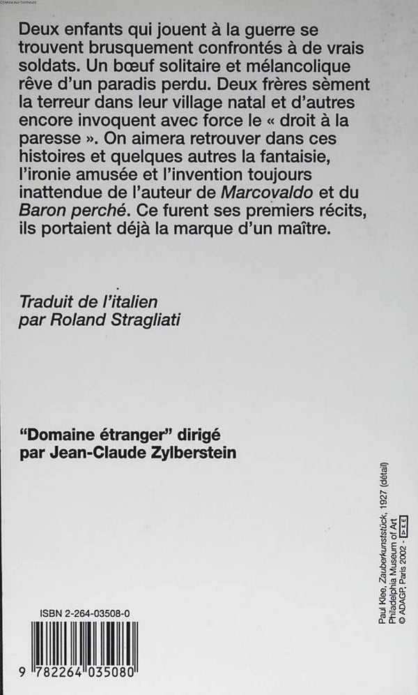 Deux enfants qui jouent à la guerre se trouvent brusquement confrontés à de vrais soldats. Un bœuf solitaire et mélancolique rêve d'un paradis perdu. Deux frères sèment la terreur dans leur village natal et d'autres encore invoquent avec force le "droit à la paresse". On aimera retrouver dans ces histoires et quelques autres la fantaisie, l'ironie amusée et l'invention toujours inattendue de l'auteur de Marcovaldo et du Baron perché . Ce furent ses premiers récits, il portaient déjà la marque d'un maître.