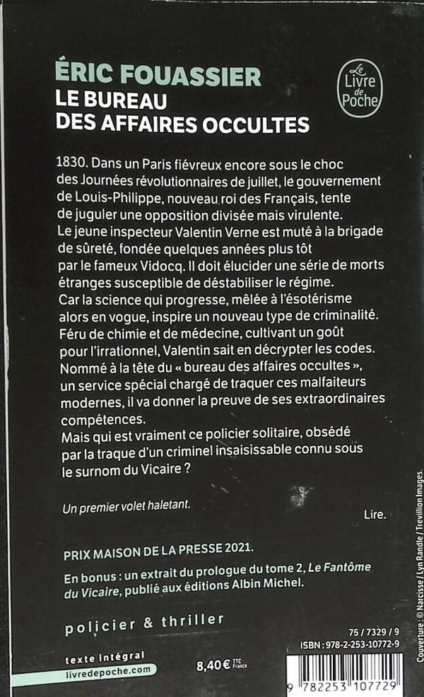 1830, dans un Paris fiévreux encore sous le choc des Journées révolutionnaires de juillet, le gouvernement de Louis-Philippe, nouveau roi des Français, tente de juguler une opposition divisée mais virulente. Le jeune inspecteur Valentin Verne est muté à la brigade de Sûreté, fondée quelques années plus tôt par le fameux Vidocq. Il doit élucider une série de morts étranges susceptible de déstabiliser le régime. Car la science qui progresse, mêlée à l’ésotérisme alors en vogue, inspire un nouveau type de criminalité. Féru de chimie et de médecine, cultivant un goût pour l’irrationnel, Valentin sait en décrypter les codes. Nommé à la tête du « bureau des affaires occultes », un service spécial chargé de traquer ces malfaiteurs modernes, il va donner la preuve de ses extraordinaires compétences.