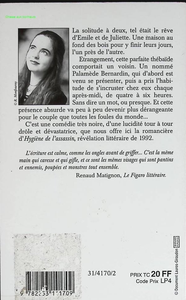 La solitude à deux, tel était le rêve d'Emile et de Juliette. Une maison au fond des bois pour y finir leurs jours, l'un près de l'autre. Etrangement, cette parfaite thébaïde comportait un voisin. Un nommé Palamède Bernardin, qui d'abord est venu se présenter, puis a pris l'habitude de s'incruster chez eux chaque après-midi, de quatre à six heures. Sans dire un mot, ou presque. Et cette présence absurde va peu à peu devenir plus dérangeante pour le couple que toutes les foules du monde…
