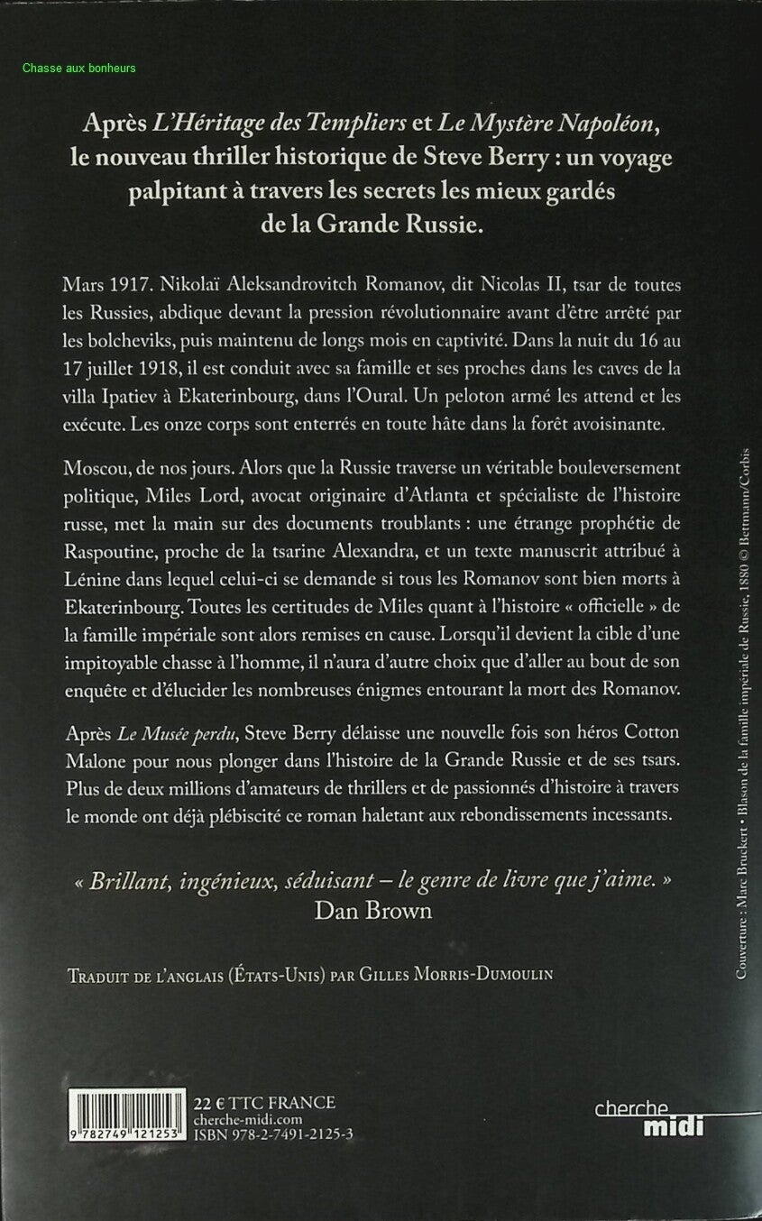 Après Le Musée perdu, Steve Berry délaisse une nouvelle fois son héros Cotton Malone pour nous plonger dans l'histoire de la Grande Russie et de ses tsars. Plus de deux millions d'amateurs de thrillers et de passionnés d'histoire à travers le monde ont déjà plébiscité ce roman haletant aux rebondissements incessants.