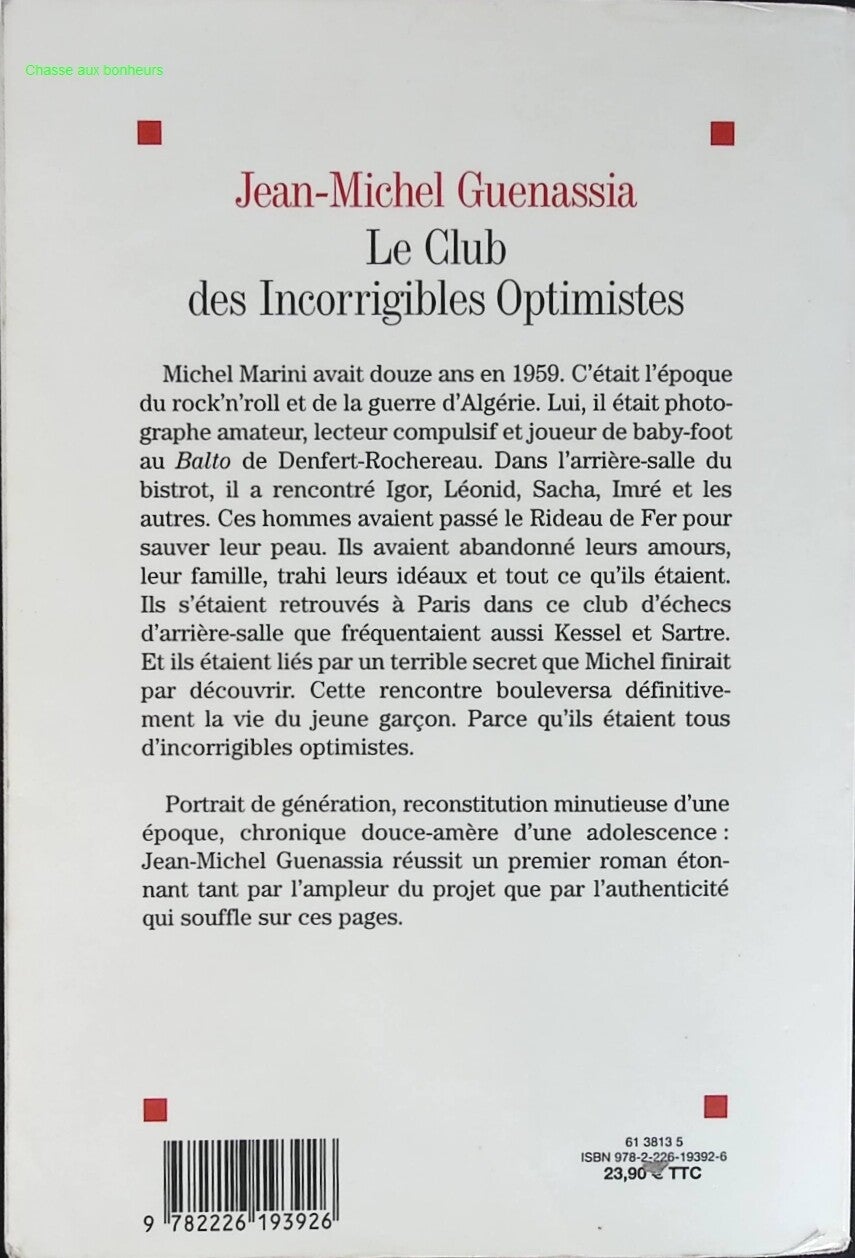Michel Marini avait douze ans en 1959. C'était l'époque du rock'n'roll et de la guerre d'Algérie. Lui, il était photographe amateur, lecteur compulsif et joueur de baby-foot au Balto de Denfert-Rochereau. Dans l'arrière-salle du bistrot, il a rencontré Igor, Léonid, Sacha, Imré et les autres. Ces hommes avaient passé le Rideau de Fer pour sauver leur peau. Ils avaient abandonné leurs amours, leur famille, trahi leurs idéaux, et tout ce qu'ils étaient. Ils s'étaient retrouvés à Paris dans ce club d'échecs d'arrière-salle que fréquentaient aussi Kessel et Sartre. Et ils étaient liés par un terrible secret que Michel finirait par découvrir. Cette rencontre bouleversa définitivement la vie du jeune garçon. Parce qu'ils étaient tous d'incorrigibles optimistes. Portrait de génération, reconstitution minutieuse d'une époque, chronique douce-amère d'une adolescence : Jean-Michel Guenassia réussit un premier roman étonnant tant par l'ampleur du projet que par l'authenticité qui souffle sur ces pages.