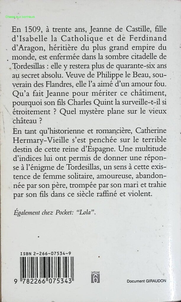 En 1509, à trente ans, Jeanne de Castille, fille d'Isabelle la Catholique et de Ferdinand d'Aragon, héritière du plus grand empire du monde, est enfermée dans la sombre citadelle de Tordesillas : elle y restera plus de quarante-six ans au secret absolu. Veuve de Philippe le Beau, souverain des Flandres, elle l'a aimé d'un amour fou. Qu'a fait Jeanne pour mériter ce châtiment, pourquoi son fils Charles Quint la surveille-t-il si étroitement ? Quel mystère plane sur le vieux château ? En tant qu'historienne et romancière, Catherine Hermary-Vieille s'est penchée sur le terrible destin de cette reine d'Espagne. Une multitude d'indices lui ont permis de donner une réponse à l'énigme de Tordesillas, un sens à cette existence de femme solitaire, amoureuse, abandonnée par son père, trompée par son mari et trahie par son fils dans ce siècle raffiné et violent.