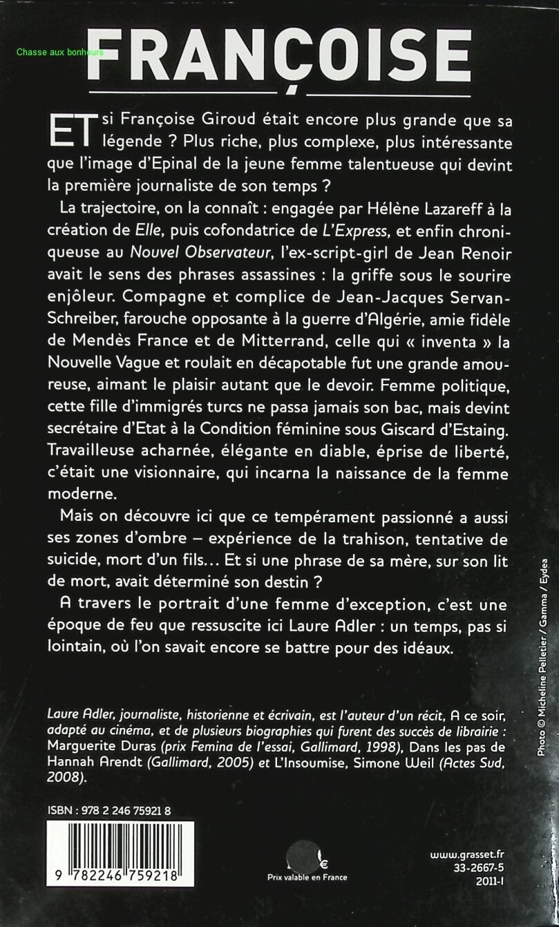 La trajectoire, on la connaît : engagée par Hélène Lazareff à la création de Elle puis cofondatrice de L'Express, et enfin chroniqueuse au Nouvel Observateur, l'ex script-girl de Jean Renoir avait le sens des phrases assassines : la griffe sous le sourire enjôleur. Compagne et complice de Jean-Jacques Servan-Schreiber, farouche opposante à la guerre d'Algérie, amie fidèle de Mendès France et de Mitterrand, celle qui "inventa" la Nouvelle Vague et roulait en décapotable fut une grande amoureuse, aimant le plaisir autant que le devoir. Femme politique, cette fille d'immigré turcs ne passa jamais son bac, mais devint Secrétaire d'Etat à la condition féminine sous Giscard d'Estaing. Travailleuse acharnée, élégante en diable, éprise de liberté, c'était une visionnaire, qui incarna la naissance de la femme moderne.