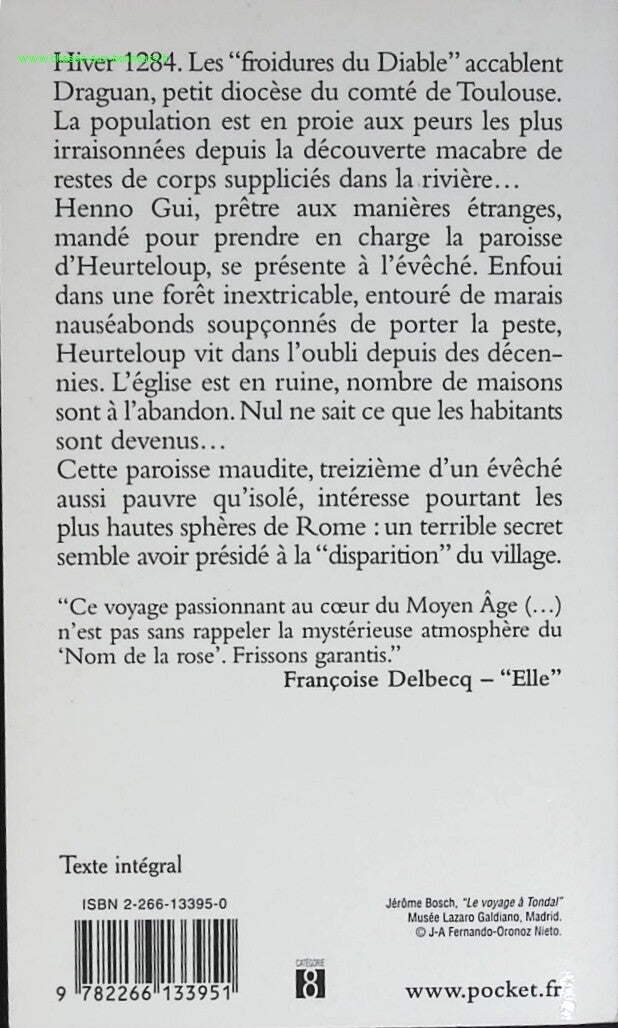 Hiver 1284. Les " froidures du Diable " accablent Draguan, petit diocèse du comté de Toulouse. La population est en proie aux peurs les plus irraisonnées depuis la découverte macabre de restes de corps suppliciés dans la rivière... Henno Gui, prêtre aux manières étranges, mandé pour prendre en charge la paroisse d'Heurteloup, se présente à l'évêché. Enfoui dans une forêt inextricable, entouré de marais nauséabonds soupçonnés de porter la peste, Heurteloup vit dans l'oubli depuis des décennies. L'église est en ruine, nombre de maisons sont à l'abandon. Nul ne sait ce que les habitants sont devenus... Cette paroisse maudite, treizième d'un évêché aussi pauvre qu'isolé, intéresse pourtant les plus hautes sphères de Rome : un terrible secret semble avoir présidé à la "disparition" du village