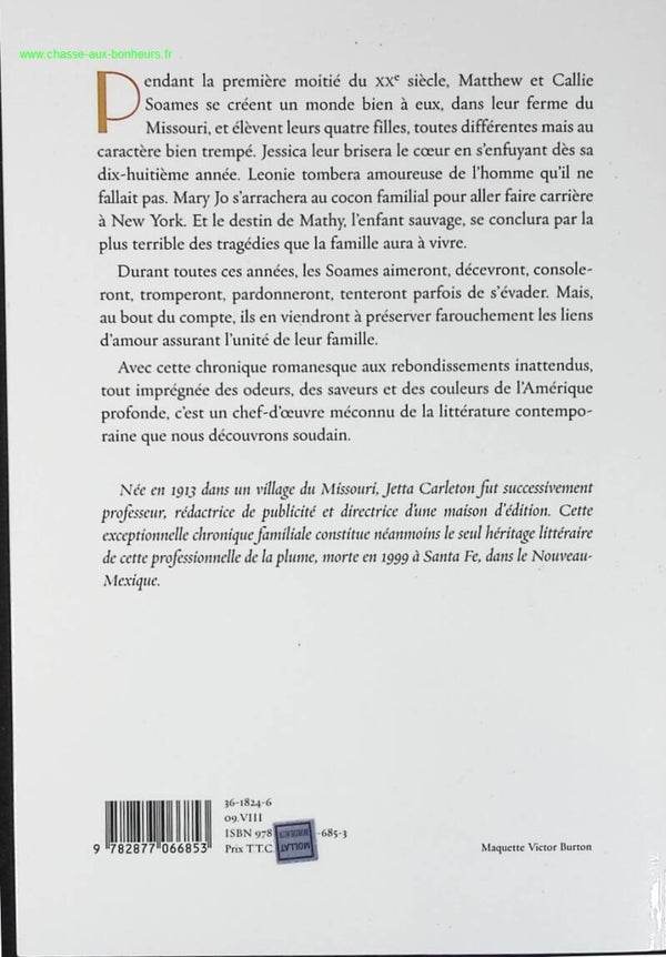 Née en 1913 dans un village du Missouri, Jetta Carleton fut successivement professeur, rédactrice de publicité et directrice d'une maison d'édition. Cette exceptionnelle chronique familiale constitue néanmoins le seul héritage littéraire de cette professionnelle de la plume, morte en 1999 à Santa Fe, dans le Nouveau-Mexique.