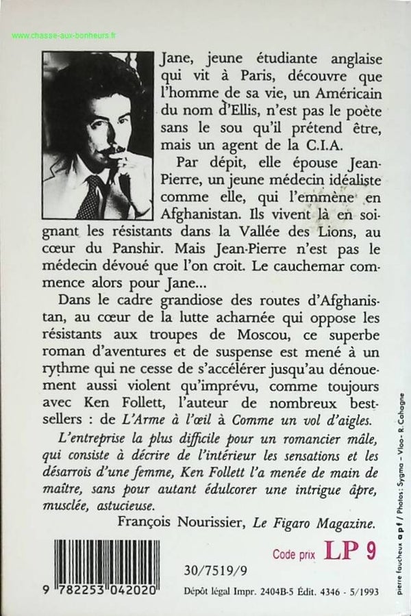 Jane, jeune étudiante anglaise qui vit à Paris, découvre que l'homme de sa vie, un Américain du nom d'Ellis, n'est pas le poète sans le sou qu'il prétend être, mais un agent de la CIA. Par dépit, elle épouse Jean-Pierre, un jeune médecin idéaliste comme elle, qui l'emmène en Afghanistan. Ils vivent là en soignant les résistants dans la Vallée des Lions, au cœur du Panshir. Mais Jean-Pierre n'est pas le médecin dévoué que l'on croit. Le cauchemar commence alors pour Jane... Dans le cadre grandiose des paysages d'Afghanistan, au cœur de la lutte acharnée qui oppose les résistants aux troupes de Moscou, ce superbe roman d'aventures et de suspense est mené à un rythme qui ne cesse de s'accélérer jusqu'au dénouement aussi violent qu'imprévu, comme toujours avec Ken Follett, l'auteur de nombreux best-sellers, de L'Arme à l'œil à Comme un vol d'aigles.