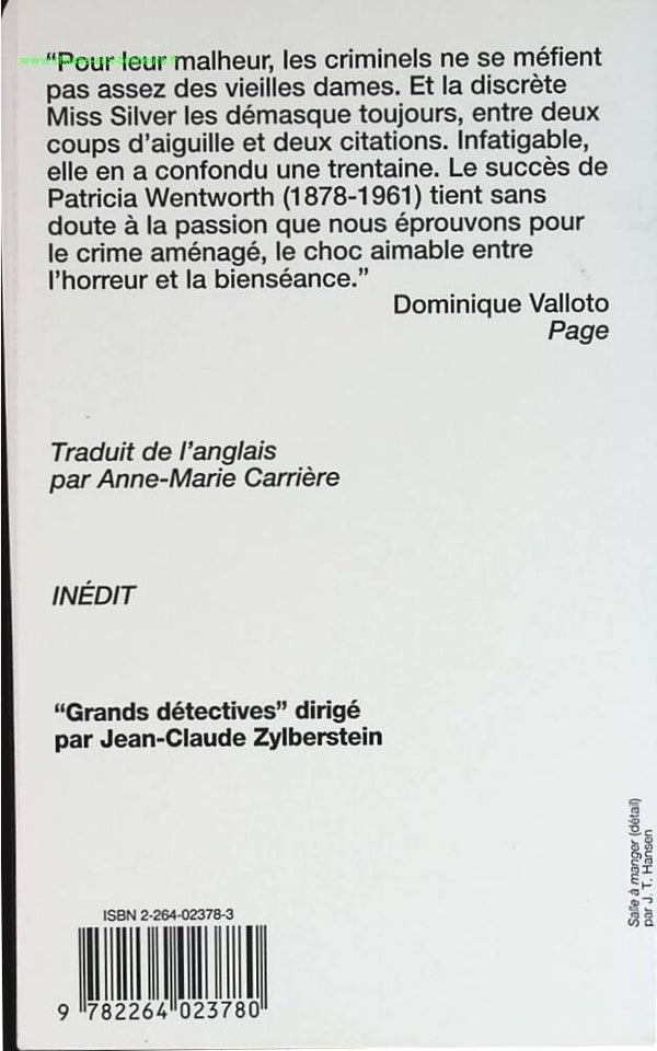 Pour leur malheur les criminels ne se méfient pas assez des vieilles dames. Et la discrète Miss Silver les démasque toujours, entre deux coups d'aiguille et deux citations. Infatigable, elle en a confondu une trentaine. Le succès de Patricia Wentworth (1878-1961) tient sans doute à la passion que nous éprouvons pour le crime aménagé, le choc aimable entre l'horreur et la bienséance.