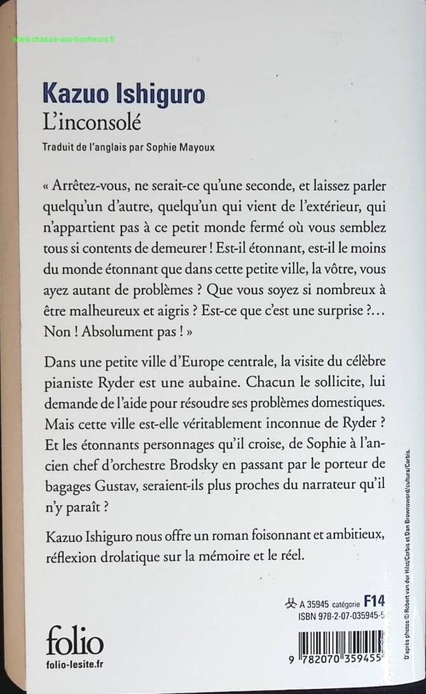 Arrêtez-vous, ne serait-ce qu'une seconde, et laissez parler quelqu'un d'autre, quelqu'un qui vient de l'extérieur, qui n'appartient pas à ce petit monde fermé où vous semblez tous si contents de demeurer ! Est-il étonnant, est-il le moins du monde étonnant que dans cette petite ville, la vôtre, vous ayez autant de problèmes ? Que vous soyez si nombreux à être malheureux et aigris ? Est-ce que c'est une surprise ?... Non ! Absolument pas !"Dans une petite ville d'Europe centrale, la visite du célèbre pianiste Ryder est une aubaine. Chacun le sollicite, lui demande de l'aide pour résoudre ses problèmes domestiques. Mais cette ville est-elle véritablement inconnue de Ryder ? Et les étonnants personnages qu'il croise, de Sophie à l'ancien chef d'orchestre Brodsky en passant par le porteur de bagages Gustav, seraient-ils plus proches du narrateur qu'il n'y paraît ?Kazuo Ishiguro nous offre un roman foisonnant et ambitieux, réflexion drolatique sur la mémoire et le réel.
