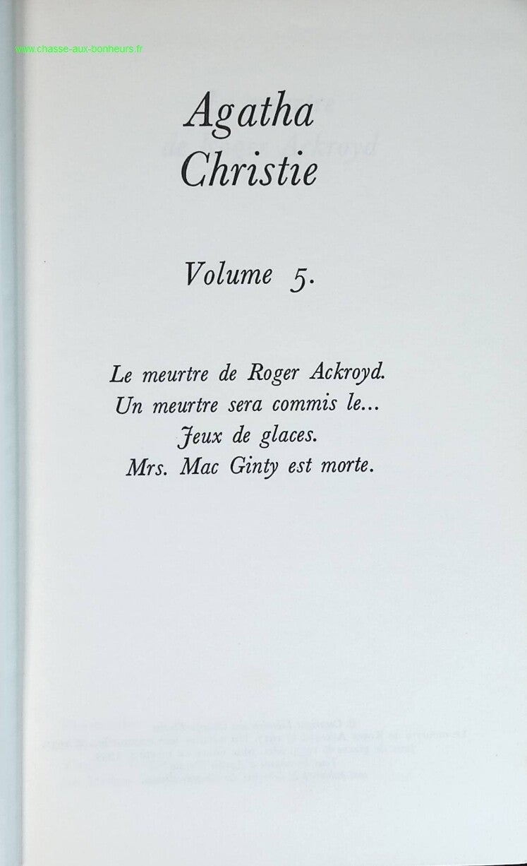 Titre : Œuvres complètes - Agatha Christie - tome 5 - Le Meurtre De Roger Ackroyd, Un Meurtre Sera Commis Le..., Jeux De Glaces, Mrs Mac Ginty Est Morte - livre