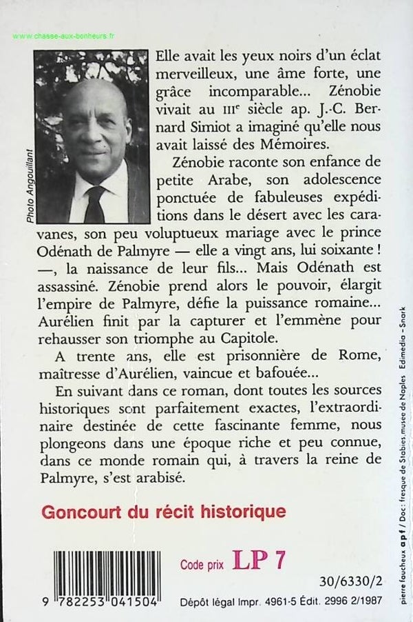 Comme Marguerite Yourcenar pour ses Mémoires d'Hadrien, Bernard Simiot a imaginé que la reine Zénobie de Palmyre a écrit ses Mémoires. Ainsi, dans ce roman qui reçut la bourse Goncourt du Récit historique en 1978, retrace-t-il l'extraordinaire destinée de la reine qui vécut au IIIe siècle après J.-C. et prit une part très active dans les transformations du monde romain d'Orient.