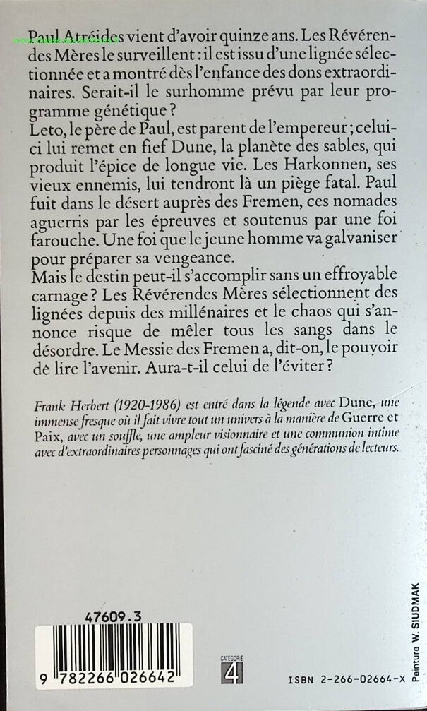 Paul Atréides vient d'avoir quinze ans. Les Révérendes Mères le surveillent : il est issu d'une lignée sélectionnée et a montré dès l'enfance des dons extraordinaires. Serait-il le surhomme prévu par leur programme génétique ? Leto, le père de Paul, est parent de l'empereur ; celui-ci lui remet en fief Dune, la planètes des sables, qui produit l'épice de longue vie. Les Harkonnen, ses vieux ennemis, lui tendront là un piège fatal. Paul fuit dans le désert auprès des Fremen, ces nomades aguerris par les épreuves et soutenus par une foi farouche. Une foi que le jeune homme va galvaniser pour préparer sa vengeance. Mais le destin peut-il s'accomplir sans un effroyable carnage ? Les Révérendes Mères sélectionnent des lignées depuis des millénaires et le chaos qui s'annonce risque de mêler tous les sangs dans le désordre. Le Messie des Fremen a, dit-on, le pouvoir de lire l'avenir. Aura-t-il celui de l'éviter ? Frank Herbert (1920-1986) est entré dans la légende avec Dune, une immense fresque où il fait vivre tout un univers à la manière de Guerre et Paix, avec un souffle, une ampleur visionnaire et une communion intime avec d'extraordinaires personnages qui ont fasciné des générations de lecteurs.