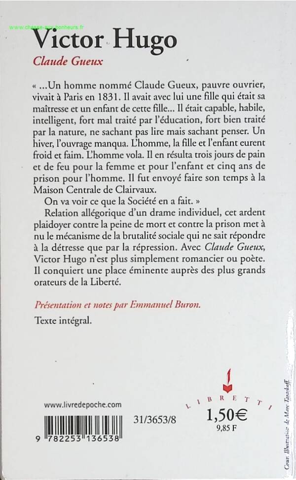 Relation allégorique d'un drame individuel, cet ardent plaidoyer contre la peine de mort et contre la prison met à nu le mécanisme de la brutalité sociale qui ne sait répondre à la détresse que par la répression. Avec Claude Gueux, Victor Hugo n'est plus simplement romancier ou poète. Il conquiert une place éminente auprès des plus grands orateurs de la Liberté.
