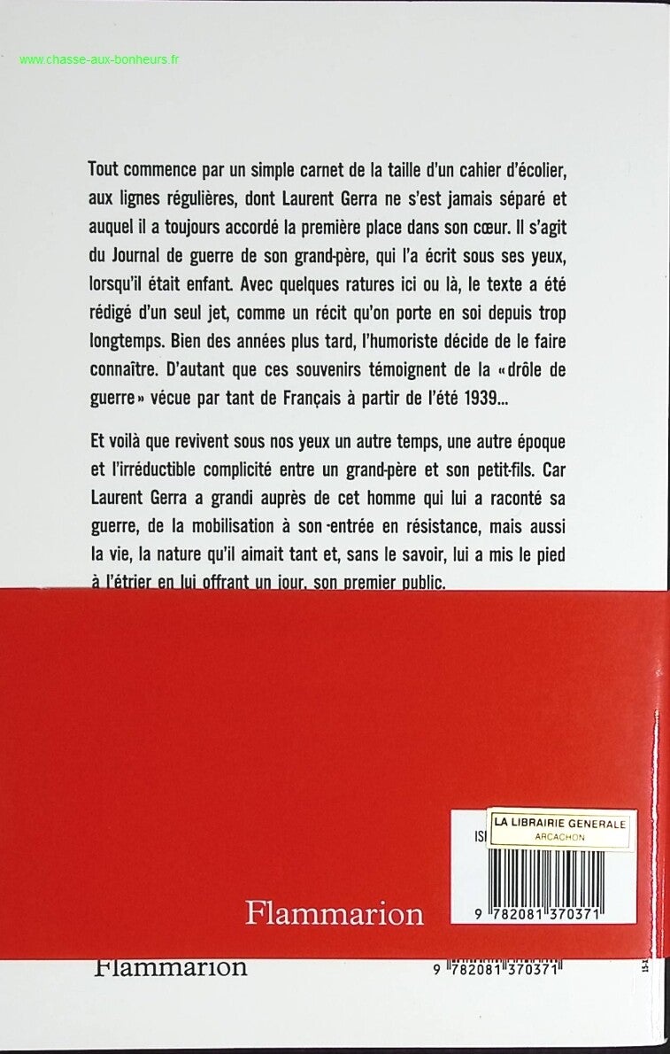 Tout commence par un simple carnet de la taille d'un cahier d'écolier, aux lignes régulières, dont Laurent Gerra ne s'est jamais séparé et auquel il a toujours accordé la première place dans son coeur. II s'agit du Journal de guerre de son grand-père, qui l'a écrit sous ses yeux, lorsqu'il était enfant. Avec quelques ratures ici ou là, le texte a été rédigé d'un seul jet, comme un récit qu'on porte en soi depuis trop longtemps. Bien des années plus tard, l'humoriste décide de le faire connaître. D'autant que ces souvenirs témoignent de la "drôle de guerre" vécue par tant de Français à partir de l'été 1939...Et voilà que revivent sous nos yeux un autre temps, une autre époque et l'irréductible complicité entre un grand-père et son petit-fils. Car Laurent Gerra a grandi auprès de cet homme qui lui a raconté sa guerre, de la mobilisation à son entrée en résistance, mais aussi la vie, la nature qu'il aimait tant et, sans le savoir, lui a mis le pied à l'étrier en lui offrant un jour, son premier public.Ce fut le déclic de la passion. II n'avait pas 5 ans...