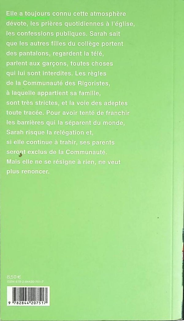 Elle a toujours connu cette atmosphère dévote, les prières quotidiennes à l'église, les confessions publiques. Sarah sait que les autres filles du collège portent des pantalons, regardent la télé, parlent aux garçons, toutes choses qui lui sont interdites. Les règles de la Communauté des Rigoristes, à laquelle appartient sa famille, sont très strictes, et la voie des adeptes toute tracée. Pour avoir tenté de franchir les barrières qui la séparent du monde, Sarah risque la relégation et, si elle continue à trahir, ses parents seront exclus de la Communauté. Mais elle ne se résigne à rien, ne veut plus renoncer.