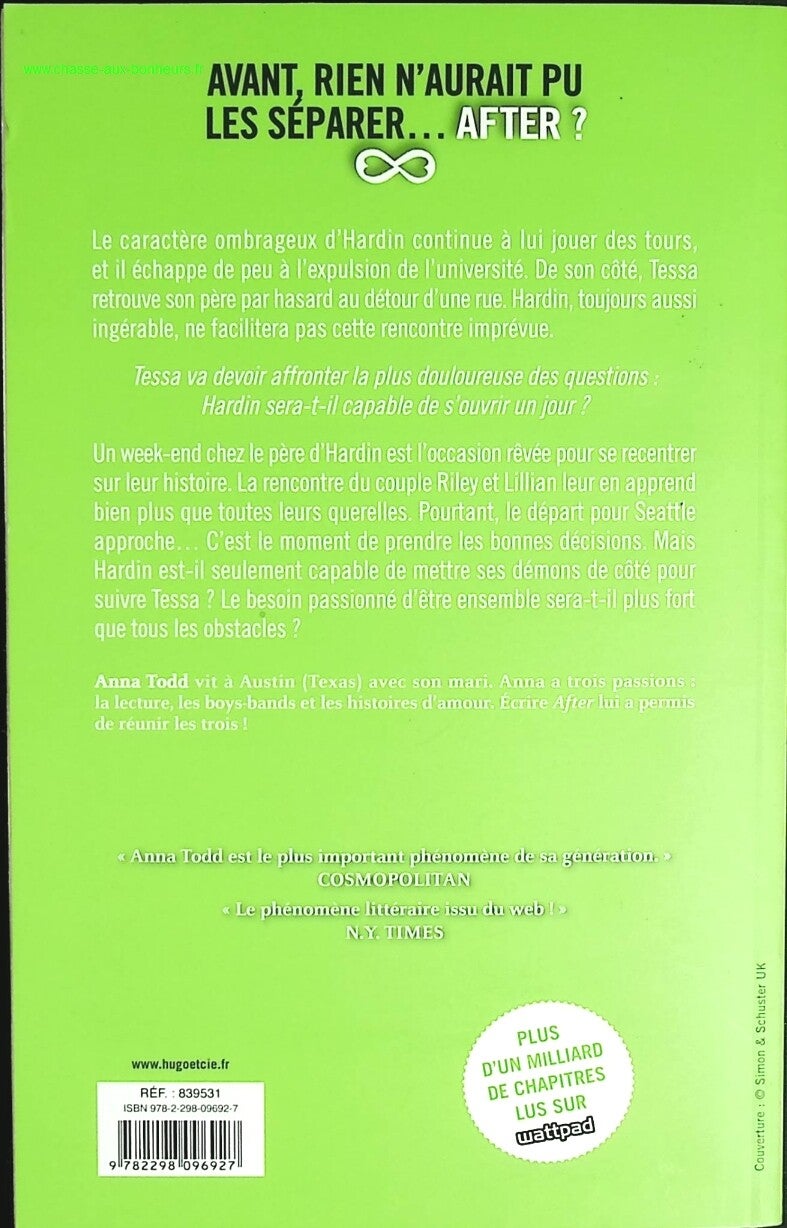 Un week-end chez le père d'Hardin est l'occasion rêvée pour se recentrer sur leur histoire. La rencontre de Riley et de Lillian va leur en apprendre bien plus que toutes leurs querelles. Pourtant, le départ pour Seattle approche... C'est le moment de prendre les bonnes décisions. Mais Hardin est-il seulement capable de mettre ses démons de côté pour suivre Tessa ? Le besoin passionné d'être ensemble sera-t-il plus fort que tous les obstacles ?