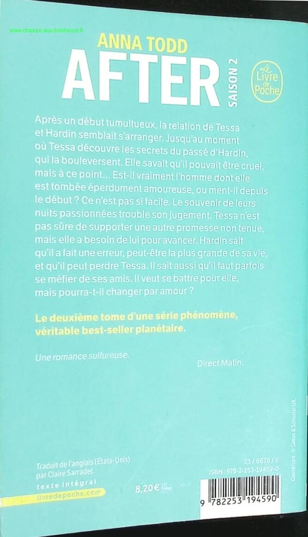 Après un début tumultueux, la relation de Tessa et Hardin semblait s’arranger. Jusqu'au moment où Tessa découvre les secrets du passé d'Hardin, qui la bouleversent. Elle savait qu'il pouvait être cruel, mais à ce point… Est-il vraiment l'homme dont Tessa est tombée éperdument amoureuse, ou ment-il depuis le début ? Ce n'est pas si facile. Le souvenir de leurs nuits passionnées trouble son jugement. Tessa n'est pas sûre de supporter une autre promesse non tenue, mais elle a besoin de lui pour avancer. Hardin sait qu'il a fait une erreur, peut-être la plus grande de sa vie, et qu'il peut perdre Tessa. Il sait aussi qu’il faut parfois se méfier de ses amis. Il veut se battre pour elle, mais pourra-t-il changer par amour ?