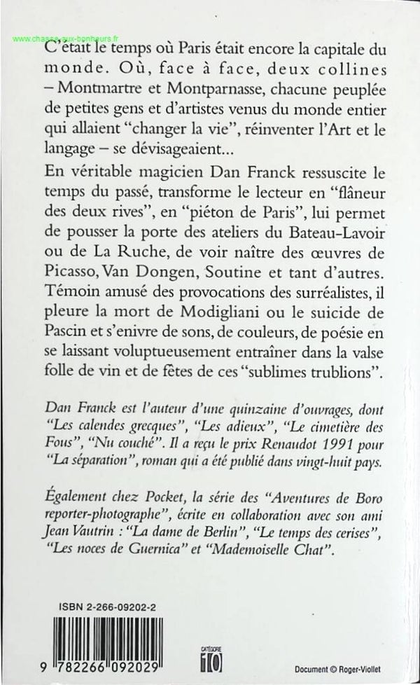 C'était le temps où Paris était encore la capitale du monde. Où, face à face, deux collines - Montmartre et Montparnasse, chacune peuplée de petites gens et d'artistes venus du monde entier qui allaient "changer la vie", réinventer l'Art et le langage - se dévisageaient... En véritable magicien Dan Franck ressuscite le temps du passé, transforme le lecteur en "flâneur des deux rives", en "piéton de Paris", lui permet de pousser la porte des ateliers du Bateau-Lavoir ou de La Ruche, de voir naître des oeuvres de Picasso, Van Dongen, Soutine et tant d'autres. Témoin amusé des provocations des surréalistes, il pleure la mort de Modigliani ou le suicide de Pascin et s'enivre de sons, de couleurs, de poésie en se laissant voluptueusement entraîner dans la valse folle de vin et de fêtes de ces "sublimes trublions".