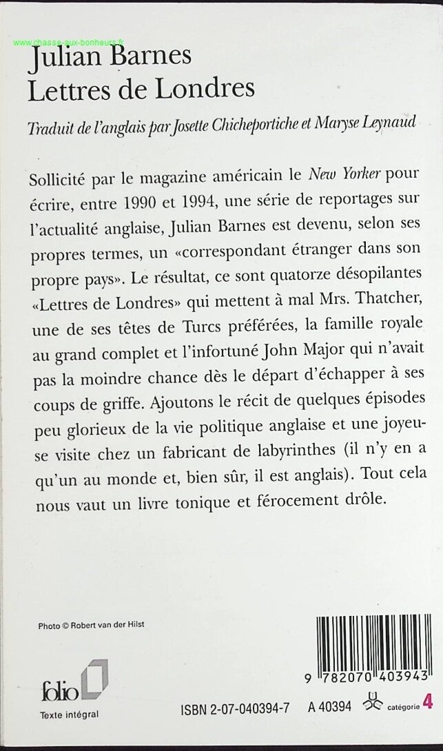 Sollicité par le magazine américain le New Yorker pour écrire, entre 1990 et 1994, une série de reportages sur l'actualité anglaise, Julian Barnes est devenu, selon ses propres termes, un "correspondant étranger dans son propre pays". Le résultat, ce sont quatorze désopilantes "Lettres de Londres" qui mettent à mal Mrs. Thatcher, une de ses têtes de Turcs préférées, la famille royale au grand complet et l'infortuné John Major qui n'avait pas la moindre chance dès le départ d'échapper à ses coups de griffe. Ajoutons le récit de quelques épisodes peu glorieux de la vie politique anglaise et une joyeuse visite chez un fabricant de labyrinthes (il n'y en a qu'un au monde et, bien sûr, il est anglais). Tout cela nous vaut un livre tonique et férocement drôle.