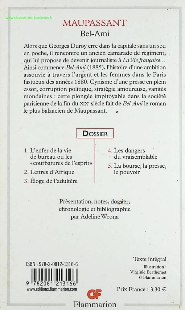 Alors que Georges Duroy erre dans la capitale sans un sou en poche, il rencontre un ancien camarade de régiment, qui lui propose de devenir journaliste à La Vie française... Ainsi commence Bel-Ami (1885), l'histoire d'une ambition assouvie à travers l'argent et les femmes dans le Paris fastueux des années 1880. Cynisme d'une presse en plein essor, corruption politique, stratégie amoureuse, vanités mondaines : cette plongée impitoyable dans la société parisienne de la fin du XIXe siècle fait de Bel-Ami le roman le plus balzacien de Maupassant.