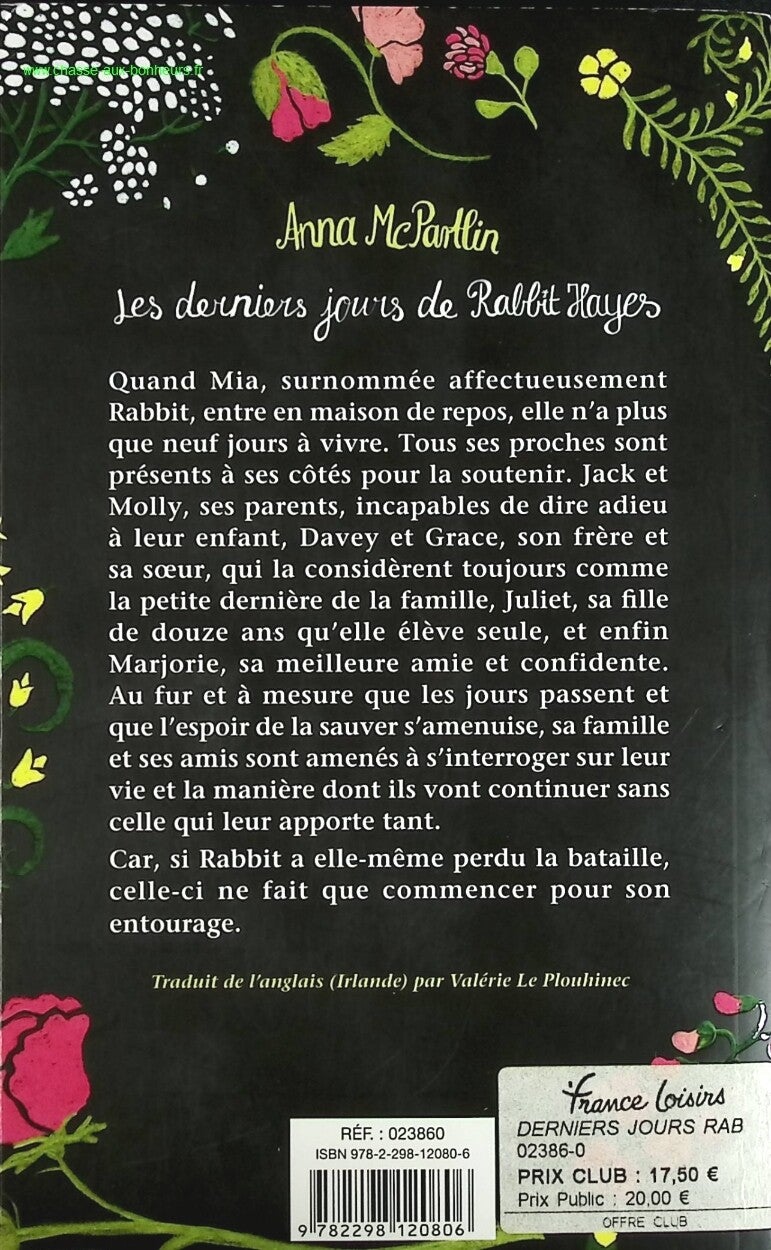 Anna McPartlin nous fait partager ces neuf journées si spéciales dans la vie de Rabbit et de ses proches. Mélancolique et drolatique à la fois, Les Derniers Jours de Rabbit Hayes nous entraîne dans un voyage émotionnel intense. À travers une galerie de personnages touchants, ce récit sur le deuil déborde d'un optimisme rare et nous rappelle que, quelles que soient les circonstances, il y a toujours de la lumière au bout du tunnel.
