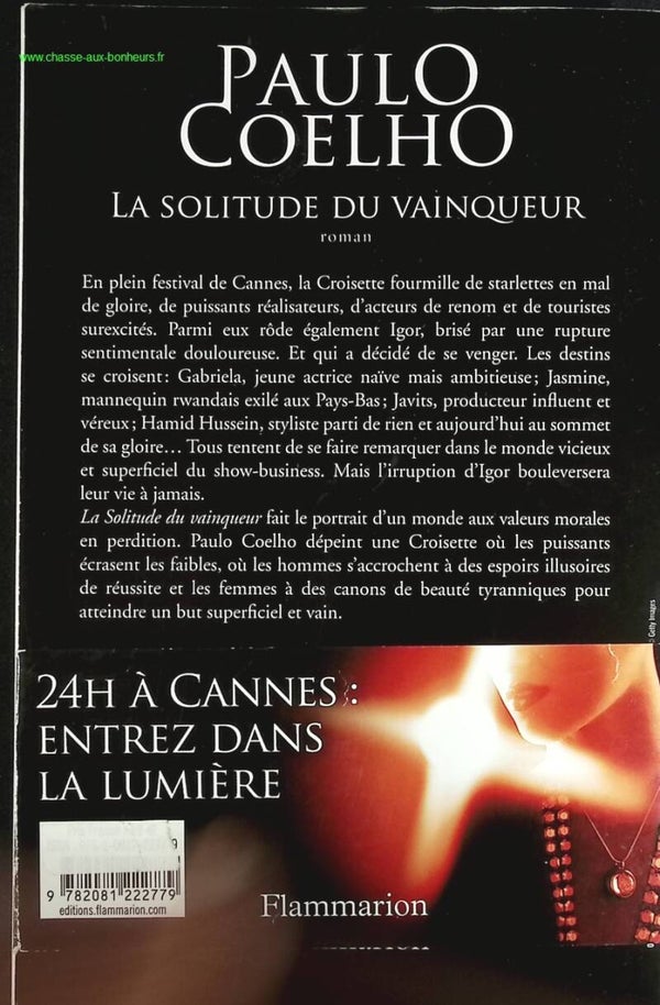 En plein festival de Cannes, la Croisette fourmille de starlettes en mal de gloire, de puissants réalisateurs, d'acteurs de renom et de touristes surexcités. Parmi eux rôde également Igor, brisé par une rupture sentimentale douloureuse. Et qui a décidé de se venger. Les destins se croisent : Gabriela, jeune actrice naïve mais ambitieuse ; Jasmine, mannequin rwandais exilé aux Pays-Bas ; Javits, producteur influent et véreux ; Hamid Hussein, styliste parti de rien et aujourd'hui au sommet de sa gloire... Tous tentent de se faire remarquer dans le monde vicieux et superficiel du show-business. Mais l'irruption d'Igor bouleversera leur vie à jamais. La Solitude du vainqueur fait le portrait d'un monde aux valeurs morales en perdition. Paulo Coelho dépeint une Croisette où les puissants écrasent les faibles, où les hommes s'accrochent à des espoirs illusoires de réussite et les femmes à des canons de beauté tyranniques pour atteindre un but superficiel et vain.
