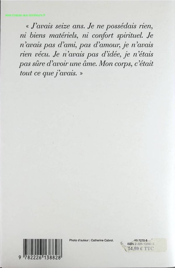J'avais seize ans. Je ne possédais rien, ni biens matériels, ni confort spirituel. Je n'avais pas d'ami, pas d'amour, je n'avais rien vécu. Je n'avais pas d'idée, je n'étais pas sûre d'avoir une âme. Mon corps, c'était tout ce que j'avais.