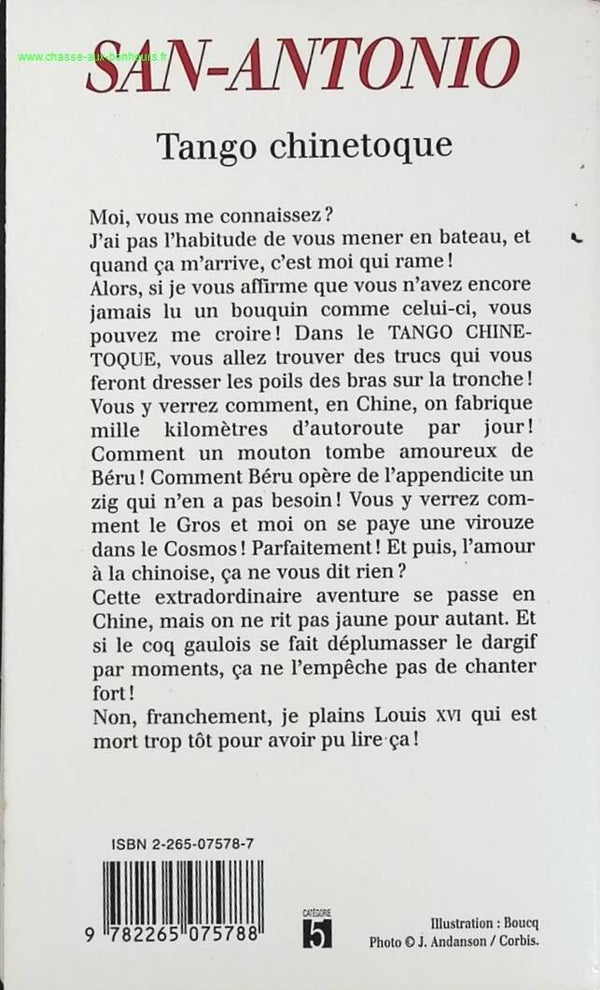 J'ai pas l'habitude de vous mener en bateau, et quand ça m'arrive, c'est moi qui rame ! Alors si je vous affirme que vous n'avez pas encore jamais lu un bouquin comme celui-ci, vous pouvez me croire ! Dans le Tango chinetoque, vous allez trouver des trucs qui vous feront dresser les poils des bras sur la tronche ! Vous y verrez comment, en Chine, on fabrique mille kilomètres d'autoroute par jour ! Comment un mouton tombe amoureux de Béru ! Comment Béru opère de l'appendicite un zig qui n'en a pas besoin ! Vous y verrez comment le Gros et moi on se paye une virouze dans le cosmos ! Parfaitement ! Et puis, l'amour à la chinoise, ça ne vous dit rien ?