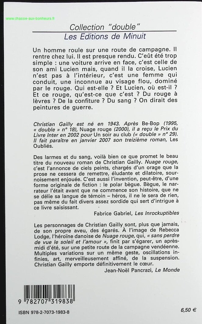 Un homme roule sur une route de campagne. Il rentre chez lui. Il est presque rendu. C'eût été trop simple : une voiture arrive en face, c'est celle de son ami Lucien mais, quand il la croise, Lucien n'est pas à l'intérieur, c'est une femme qui conduit, une inconnue au visage flou, dominé par le rouge. Qui est-elle ? Et Lucien, où est-il ? Et ce rouge, qu'est-ce que c'est ? Du rouge à lèvres ? De la confiture ? Du sang ? On dirait des peintures de guerre. « Des larmes et du sang, voilà bien ce que promet le beau titre du nouveau roman de Christian Gailly. Nuage rouge, c'est l'annonce de ciels peints, chargés d'un orage que la prose ne cessera de remettre, éludante et dilatoire, sournoisement enjouée. C'est aussi l'invention, peut-être, d'une forme originale de fiction : le polar bègue. Bègue, le narrateur l'était avant que ne commence son histoire, que ne se délie sa langue de témoin - héros, il ne le sera de rien, pas même du fait divers assez sordide qui sert d'intrigue à ce livre saisissant. » (Fabrice Gabriel, Les Inrockuptibles) « Les personnages de Christian Gailly sont, plus que jamais, de son propre aveu, des égarés. À l'image de Rebecca Lodge, l'héroïne danoise de Nuage rouge, qui, "sans perdre de vue le soleil et l'amour", finit par s'égarer, un après-midi d'été, sur une petite route de la campagne vendéenne. Multiples variations sur un même geste, oscillations infinies, art, merveilleusement affiné, de la suspension. Christian Gailly emporte définitivement le cœur. » (Jean-Noël Pancrazi, Le Monde) Nuage rouge est paru en 2000.