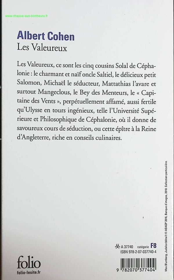 Les Valeureux, ce sont les cinq cousins Solal de Céphalonie : le charmant et naïf oncle Saltiel, le délicieux petit Salomon, Michaël le séducteur, Mattathias l'avare et surtout Mangeclous, le bey des menteurs, le "capitaine des vents", perpétuellement affamé, aussi fertile qu'Ulysse en tours ingénieux, telle l'Université Supérieure et Philosophique de Céphalonie, où il donne de savoureux cours de séduction, ou cette épître à la Reine d'Angleterre, riche en conseils culinaires.