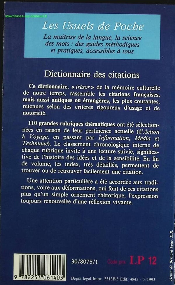 Ce dictionnaire, " trésor " de la mémoire culturelle de notre temps, rassemble les citations françaises, mais aussi antiques ou étrangères, les plus courantes, retenues selon des critères rigoureux d'usage et de notoriété. 110 grandes rubriques thématiques ont été sélectionnées en raison de leur pertinence actuelle (d'Action à Voyage, en passant par Information, Média et Technique). Le classement chronologique interne de chaque rubrique invite à une lecture suivie, significative de l'histoire des idées et de la sensibilité. En fin de volume, les index, très détaillés, permettent de trouver ou de retrouver facilement une citation. Une attention particulière a été accordée aux traditions, voire aux déformations, qui font de ces citations plus qu'un simple ornement rhétorique, l'expression toujours renouvelée d'une réflexion vivante.