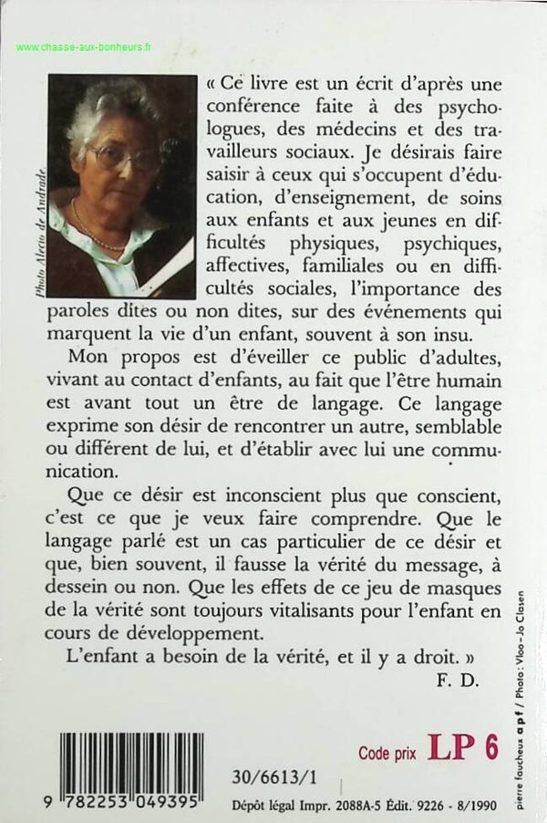 Ce livre est un écrit d'après une conférence faite à des psychologues, des médecins et des travailleurs sociaux. Je désirais faire saisir à ceux qui s'occupent d'éducation, d'enseignement, de soins aux enfants et aux jeunes en difficultés physiques, psychiques, affectives, familiales ou en difficultés sociales, l'importance des paroles dites ou non dites, sur des événements qui marquent la vie d'un enfant, souvent à son insu.
