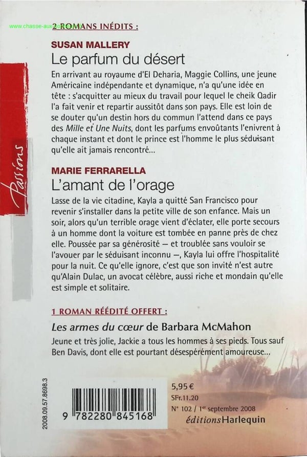 e parfum du désert : En arrivant au royaume d'El Deharia, Maggie Collins, une jeune Américaine indépendante et dynamique, n'a qu'une idée en tête : s'acquitter au mieux du travail pour lequel le cheik Qadir l'a fait venir et repartir aussitôt dans son pays. Elle est loin de se douter qu'un destin hors du commun l'attend dans ce pays des Mille et Une Nuits, dont les parfums envoûtants l'enivrent à chaque instant et dont le prince est l'homme le plus séduisant qu'elle ait jamais rencontré... L'amant de l'orage : Lasse de la vie citadine, Kayla a quitté San Francisco pour revenir s'installer dans la petite ville de son enfance. Mais un soir, alors qu'un terrible orage vient d'éclater, elle porte secours à un homme dont la voiture est tombée en panne près de chez elle. Poussée par sa générosité - et troublée sans vouloir se l'avouer par le séduisant inconnu -, Kayla lui offre l'hospitalité pour la nuit. Ce qu'elle ignore, c'est que son invité n'est autre qu'Alain Dulac, un avocat célèbre, aussi riche et mondain qu'elle est simple et solitaire.