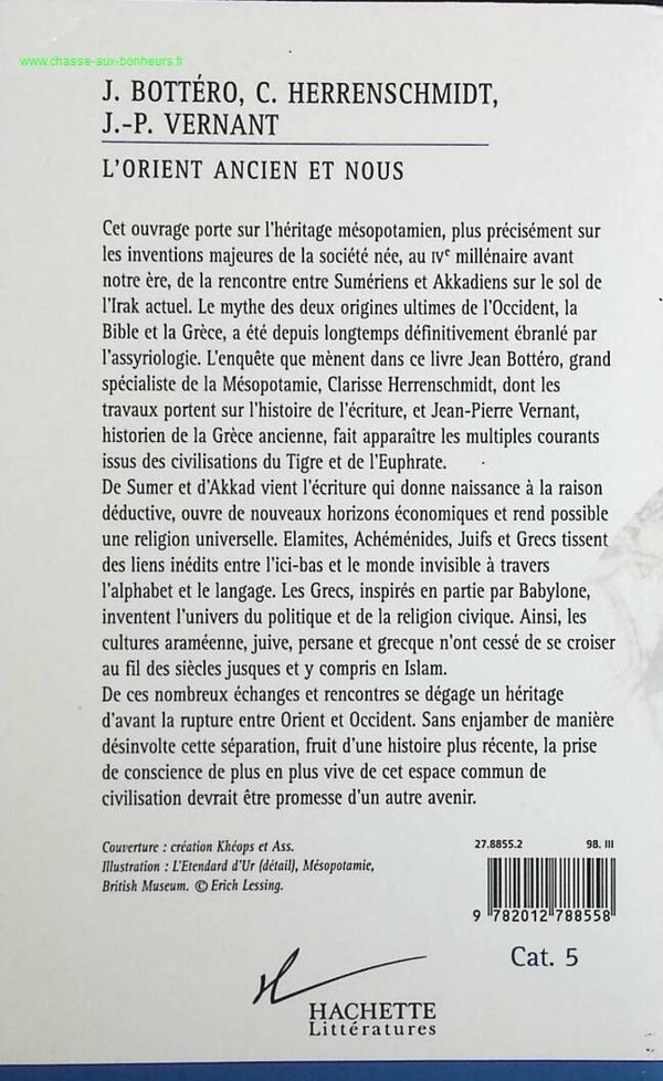 Cet ouvrage porte sur l'héritage mésopotamien, plus précisément sur les inventions majeures de la société née, au IVe millénaire avant notre ère, de la rencontre entre Sumériens et Akkadiens sur le sol de l'Irak actuel. Le mythe des deux origines ultimes de l'Occident, la bible et la Grèce, a été depuis longtemps définitivement ébranlé par l'assyriologie. L'enquête que mènent dans ce livre Jean Bottéro, grand spécialiste de la Mésopotamie, Clarisse Herrenschmidt, dont les travaux portent sur l'histoire de l'écriture, et Jean-Pierre Vernant, historien de la Grèce ancienne, fait apparaître les multiples courants issus des civilisations du Tigre et de l'Euphrate. De Sumer et d'Akkad vient l'écriture qui donne naissance à la raison déductive, ouvre de nouveaux horizons économiques et rend possible une religion universelle. Elamites, Achéménides, Juifs et Grecs tissent des liens inédits entre l'ici-bas et le monde invisible à travers l'alphabet et le langage. Les Grecs, inspirés en partie par Babylone, inventent l'univers du politique et de la religion civique. Ainsi, les cultures araméenne, juive, persane et grecque n'ont cessé de se croiser au fil des siècles jusque et y compris en Islam. De ces nombreux échanges et rencontres se dégage un héritage d'avant la rupture entre Orient et Occident. Sans enjamber de manière désinvolte cette séparation, fruit d'une histoire plus récente, la prise de conscience de plus en plus vive de cet espace commun de civilisation devrait être promesse d'un autre avenir.